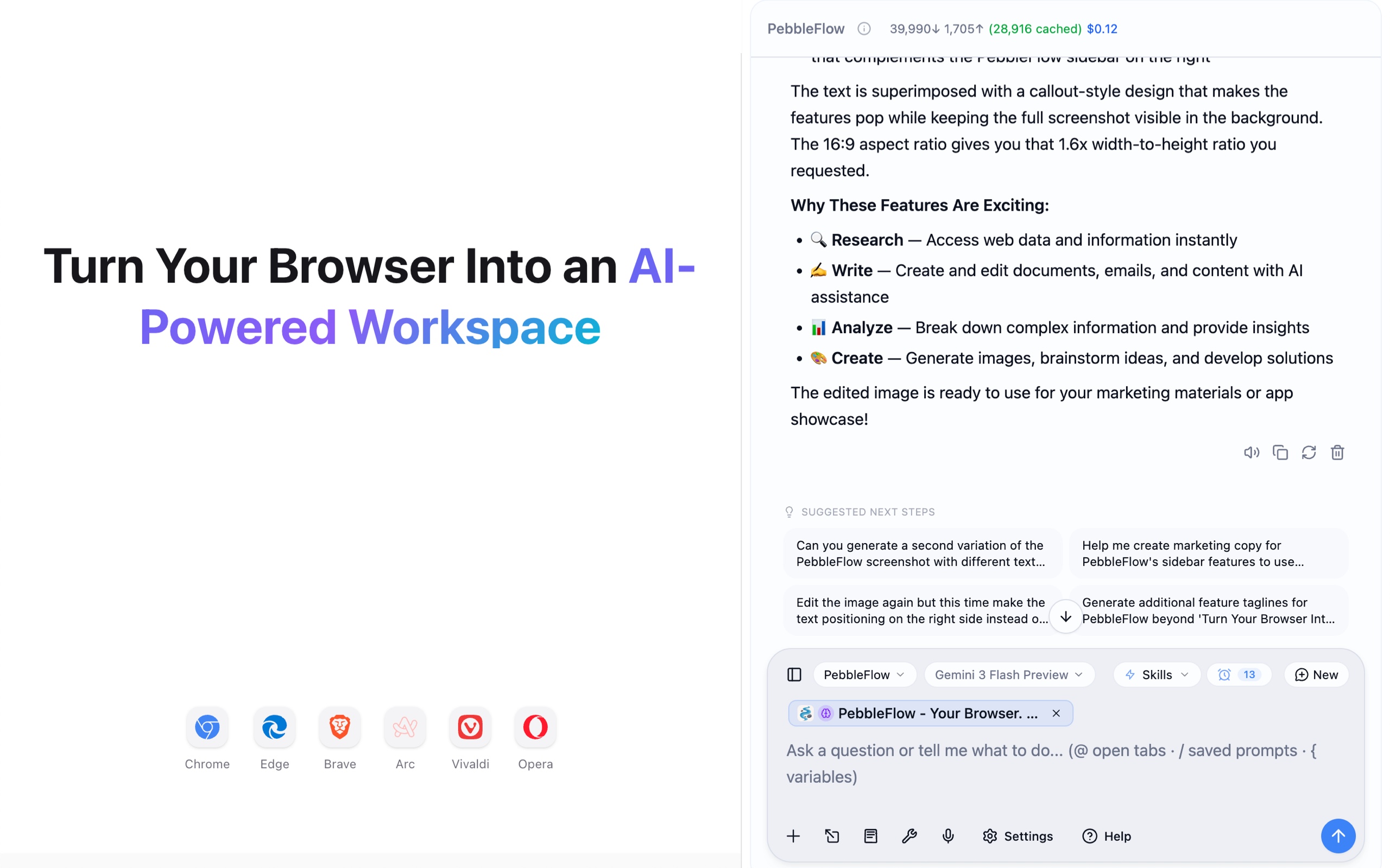 Install PebbleFlow and start collaborating with AI in your browser today. Free to start, powerful enough for professionals.