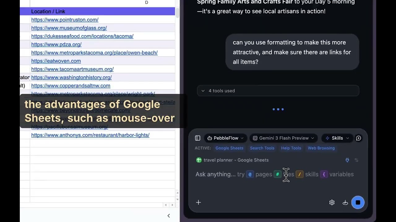 This video demonstrates how PebbleFlow can use Google Sheets and Perplexity research to create a travel itinerary.