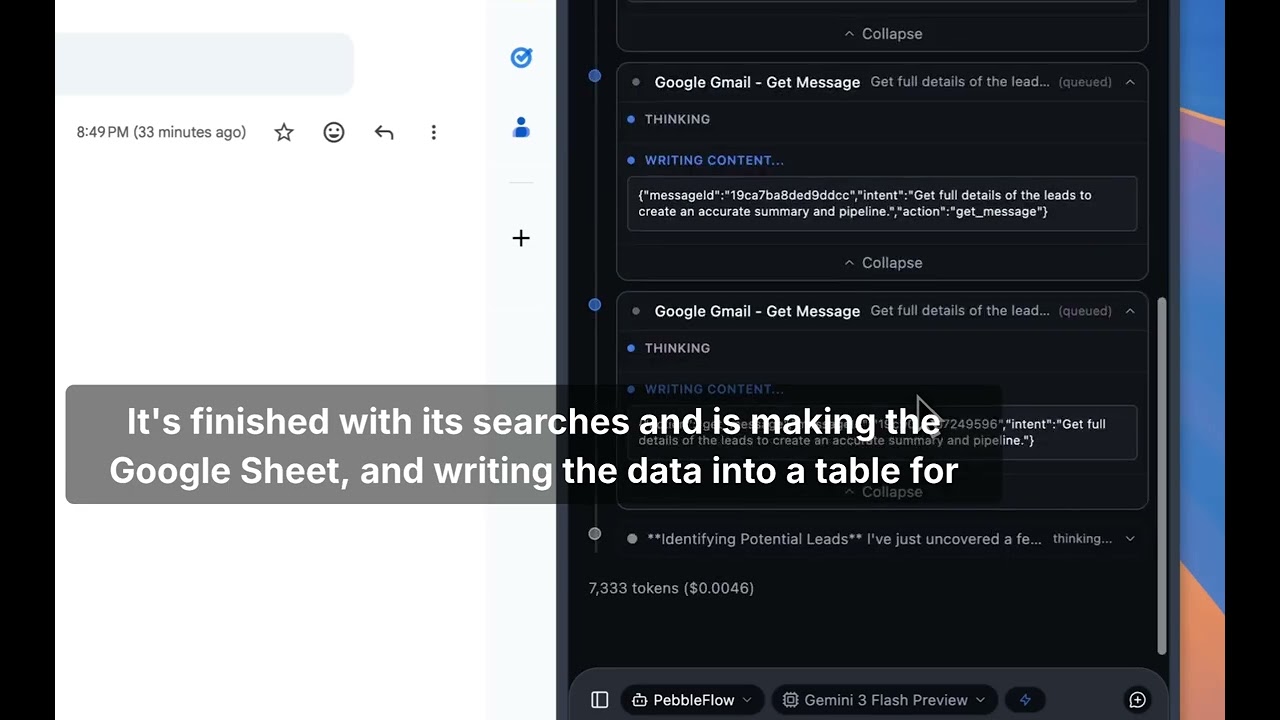 Demo showing how a single prompt can search email, find prospects, and generate a google sheets sales tracker, and update with accurate information.